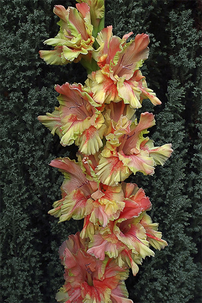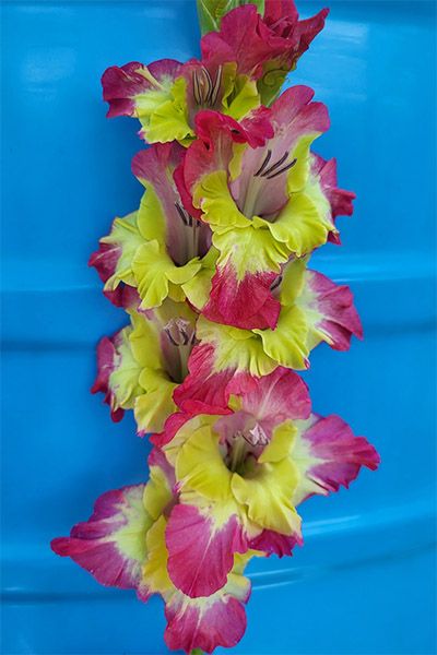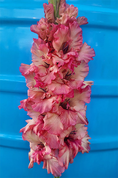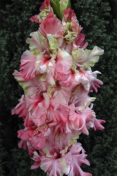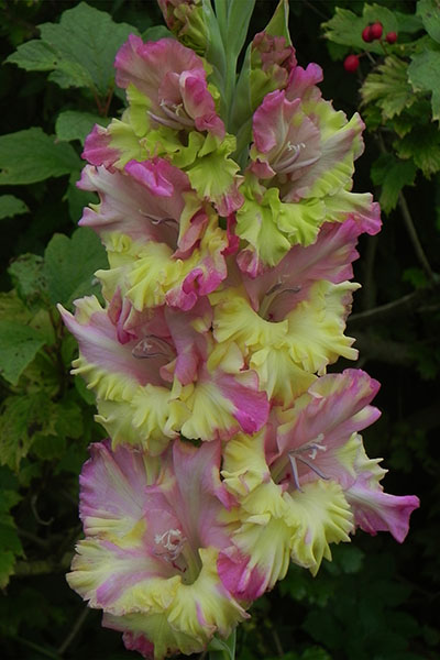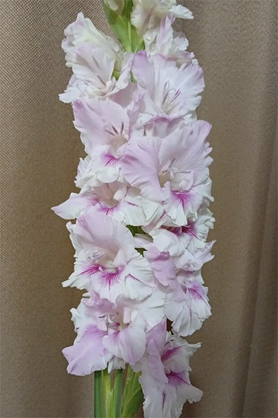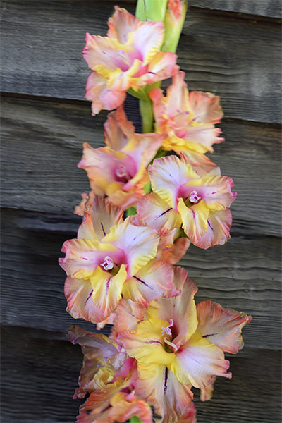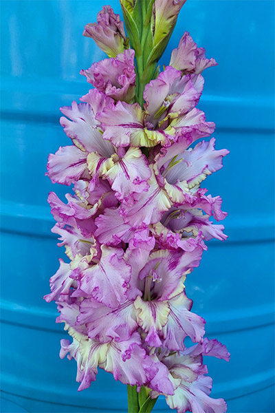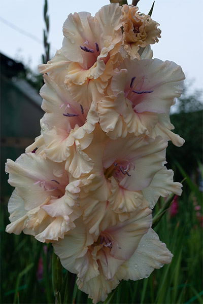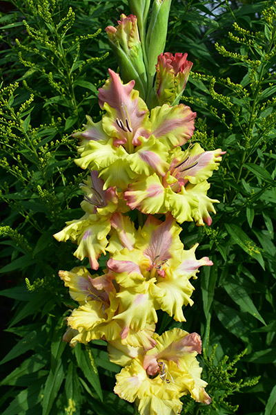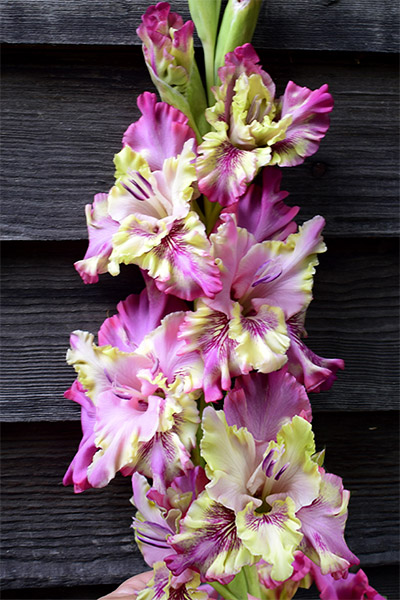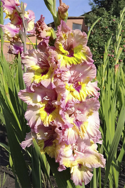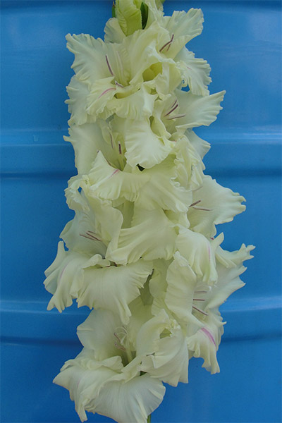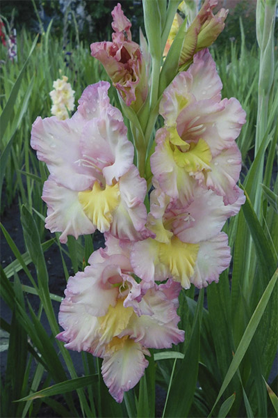 Салатово-жёлтый с розовым центром лепестков. Прочный колос, хорошее размножение